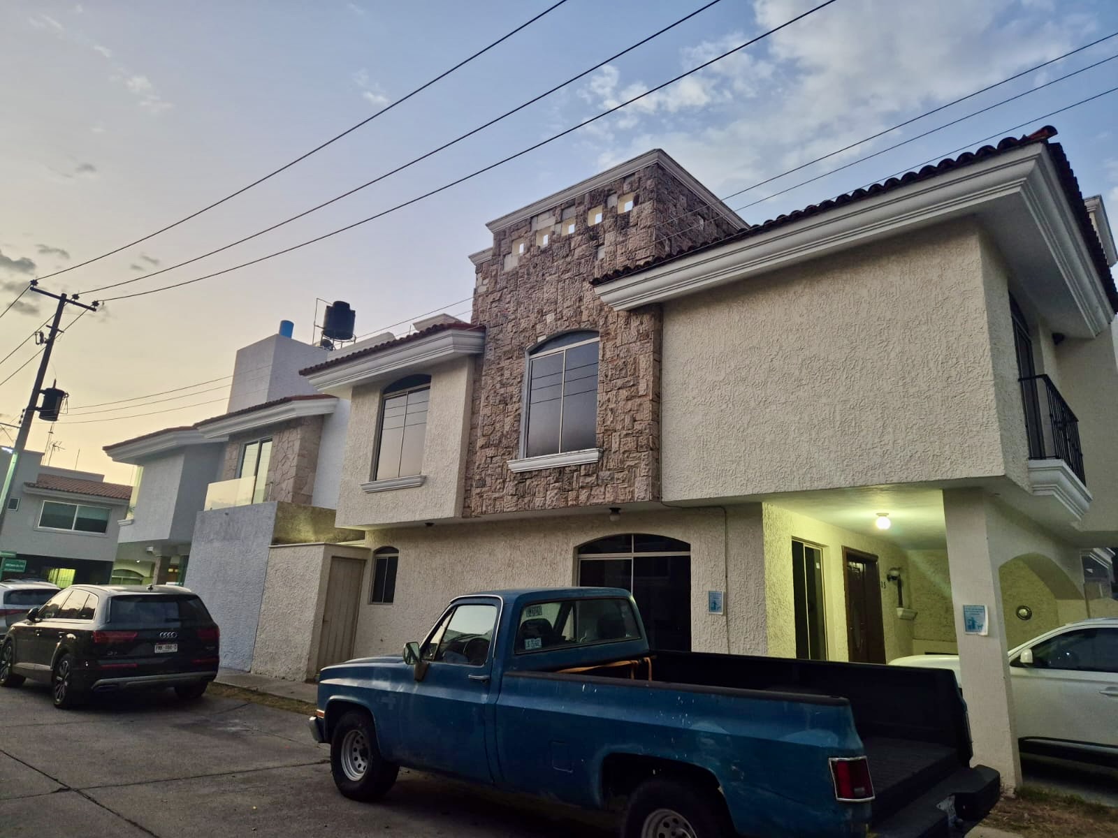 La planta baja dispone de una sala, comedor, terraza, medio baño, cocina integral, cuarto de lavado y patio de servicio. La planta alta incluye una recámara principal con baño y closet-vestidor, dos recámaras adicionales con closet y un segundo baño completo, así como una sala de estar.